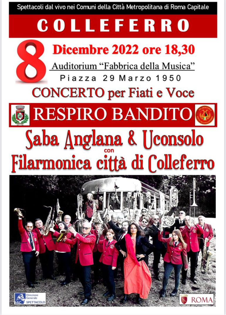 COLLEFERRO – Giovedì 8 Dicembre alle ore 18.30, presso l’Auditorium Fabbrica della Musica in Piazza 29 Marzo 1950 a Colleferro Scalo, avrà luogo il concerto per voce e fiati “Respiro bandito”, di Saba Anglana e UConsolo, insieme alla Banda Filarmonica di Colleferro.