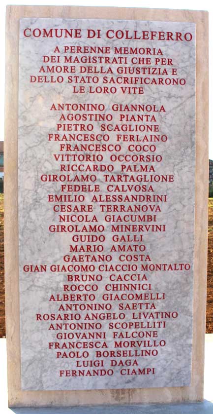 Si ricordano “A perenne memoria dei Magistrati che per amore della Giustizia e dello Stato sacrificarono le loro vite”: Antonino Giannola, Agostino Pianta, Pietro Scaglione, Francesco Ferlaino, Francesco Coco, Vittorio Occorsio, Riccardo Palme, Girolamo Tartaglione, Fedele Calvosa, Emilio Alessandrini, Cesare Terranova, Nicola Giacumbi, Girolamo Minervini, Guido Galli, Mario Amato, Gaetano Costa, Gian Giacomo Ciaccio Montalto, Bruno Caccia, Rocco Chinnici, Alberto Giacomelli, Antonino Saeta, Rosario Angelo Livatino, Antonio Scopellitti, Giovanni Falcone, Francesca Morvillo, Paolo Borsellino, Luigi Dava e Fernando Ciampi.