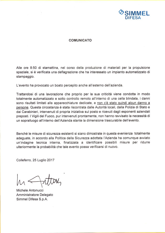 «Alle ore 8:50 di stamattina, nei corso della produzione di materiali per la propulsione spaziale, si è verificata una deflagrazione che ha interessato un impianto automatizzato di stampaggio.