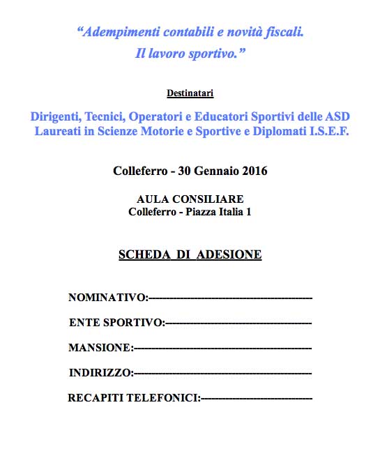 COLLEFERRO (RM) – Il Coni Comitato Regionale ed il Comune di Colleferro, in collaborazione con la Scuola dello Sport, hanno organizzato per il 30 Gennaio un interessante convegno sul tema “Adempimenti contabili e novità fiscali. Il lavoro sportivo”.