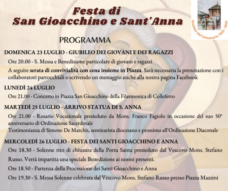 In concomitanza con il Giubileo Straordinario della Chiesa di San Giacchino di Colleferro Scalo (a 100 anni dalla sua consacrazione), la Festa di S. Anna, soprattutto per quanto riguarda il programma religioso, condivide diverse iniziative.