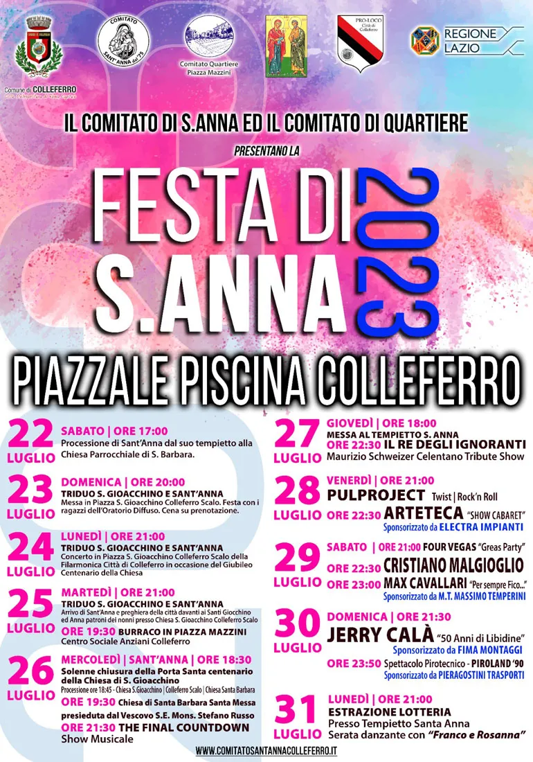 COLLEFERRO – Domenica 23 Luglio a Colleferro iniziano i festeggiamenti in onore di Sant’Anna organizzata dal Comitato S. Anna e dal Comitato di Quartiere Piazza Mazzini, con il contributo del Comune di Colleferro e la collaborazione dell’Ass. Pro-Loco.