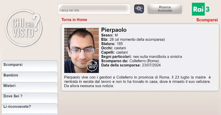 Anche il sito internet di “Chi l’ha visto” (lo storico programma Tv di Rai3) ha inserito l’appello relativo alle ricerche di Pierpaolo che al momento della scomparsa indossava una maglietta bicolore, bianca con spalle e maniche blu, bermuda blu e scarpe in tela bianche e blu della Tommy.