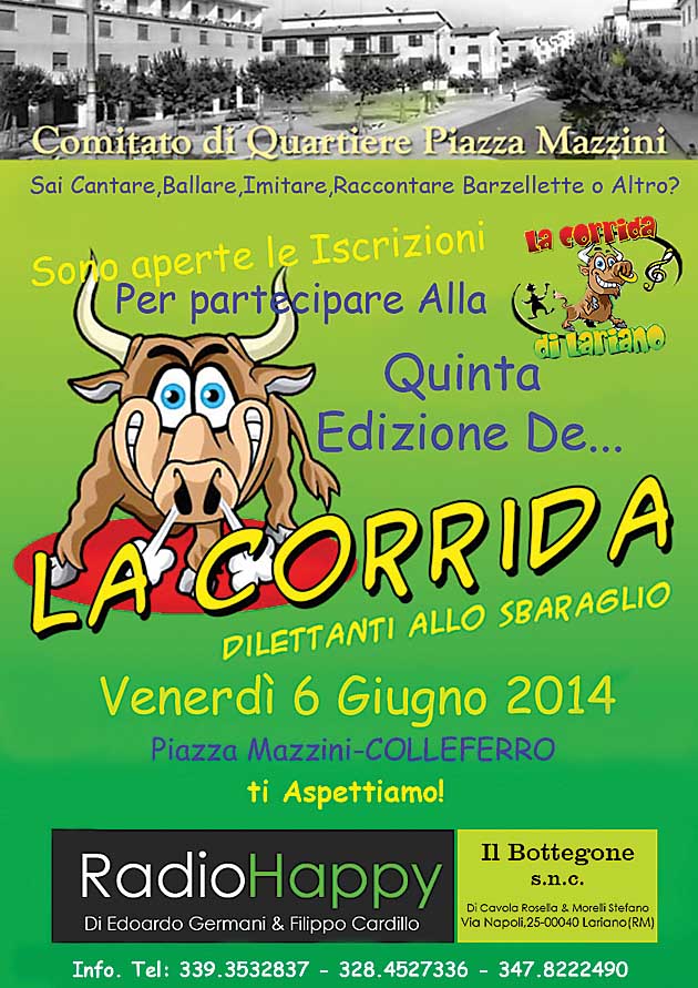 COLLEFERRO (RM) – Sono aperte le iscrizioni per partecipare alla V Edizione de “La Corrida – Dilettanti allo sbaraglio”, simpaticissima e seguitissima iniziativa organizzata dal Comitato di Quartiere di Piazza Mazzini.