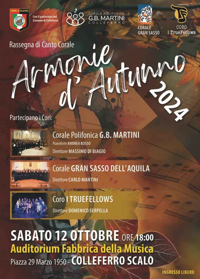 COLLEFERRO – Questo Sabato 12 Ottobre alle ore 18 presso l’Auditorium Fabbrica della Musica a Colleferro Scalo ci sarà un bellissimo appuntamento con la musica, si terrà infatti la rassegna di Canto Corale “Armonie d’Autunno 2024”.