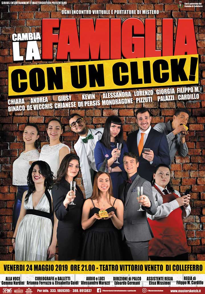 COLLEFERRO – Venerdì 24 Maggio, alle ore 21, il Teatro Vittorio Veneto di Colleferro ospiterà l’appuntamento annuale con la compagnia teatrale Mastersketch, che porterà in scena il suo nuovo spettacolo, “Cambia la Famiglia con un Click!”.