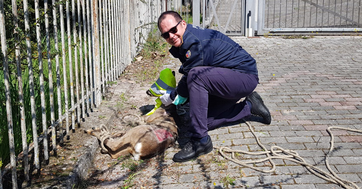 Dopo l’inutile tentativo di aiutare il capriolo a liberarsi dalle inferriate – anche con l’intento di non stressare ulteriormente l’animale – il Dr. Tiberi, anche in considerazione del suo forte stato di agitazione, gli somministrava la giusta dose di narcotico.