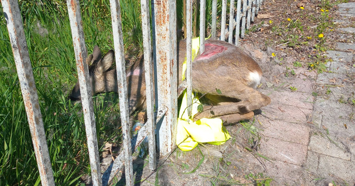 Il capriolo – un esemplare maschio giovane – aveva tentato di passare attraverso le assi di ferro per entrare nel parco, rimanendo però bloccato all’altezza del bacino.