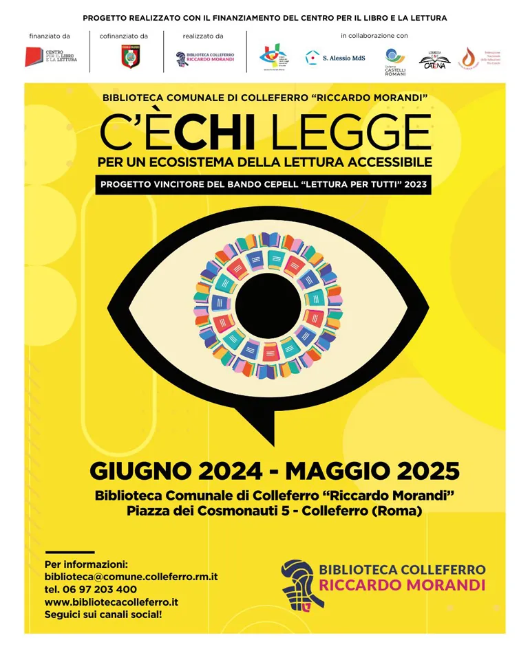 COLLEFERRO – “C’èChi legge: per un ecosistema della lettura accessibile” è il progetto del Comune di Colleferro e della Biblioteca Comunale “Riccardo Morandi”, in collaborazione con l’Azienda di servizi alla persona disabile visiva S. Alessio – Margherita di Savoia, il Consorzio Sistema Castelli Romani, la Federazione Nazionale delle Istituzioni Pro Ciechi, la Libreria C&C Catena e l’Unione Italiana dei Ciechi e degli Ipovedenti Sezione Territoriale di Roma.