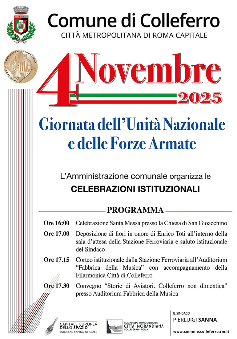 COLLEFERRO – Anche Colleferro in occasione del 4 Novembre celebra la Giornata dell’Unità Nazionale e Giornata delle Forze Armate.