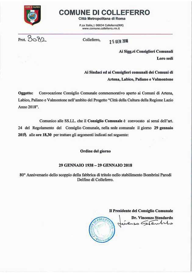 Nel pomeriggio alle ore 18, presso l’aula consiliare del comune di Colleferro si terrà una seduta straordinaria del Consiglio comunale congiunto con i comuni di Paliano, Labico, Valmontone e Artena, partner del Progetto Città della Cultura 2018 di cui il comune di Colleferro è capofila.