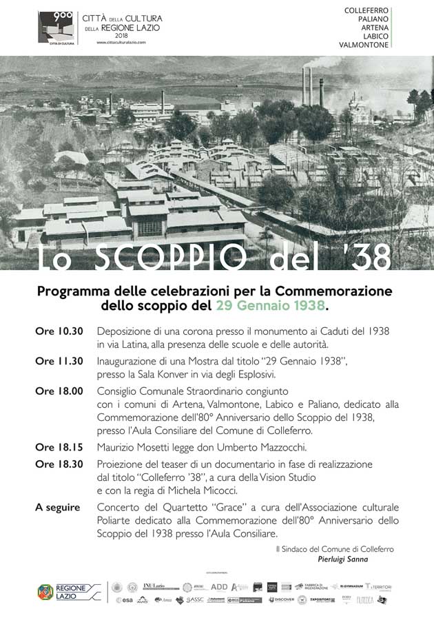 Al tragico evento, nel quale persero la vita sessanta lavoratori non solo di Colleferro ma anche dei comuni limitrofi, è dedicata una mostra fotografica, dal titolo “29 Gennaio 1938”, appositamente allestita presso la sala A. Ripari (ex Sala Konver) in Via degli Esplosivi, che è stata inaugurata subito dopo.