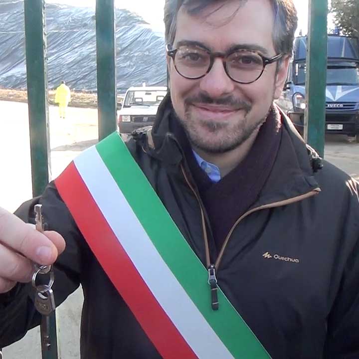 Subito dopo l’intervento del Sindaco Sanna ci si è spostati a ridosso dell’ingresso in discarica dove il primo cittadino ha simbolicamente chiuso la catena del cancello con un lucchetto tricolore mostrandone fieramente la chiave…