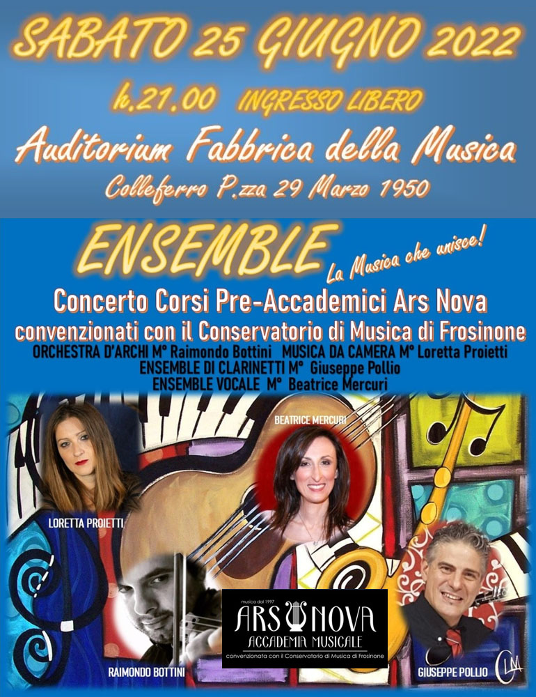 Il titolo del Concerto, “Ensemble”, ben sintetizza il risultato finale dei Corsi di Musica d’Insieme dell’Anno Accademico che volge al termine, e contemporaneamente sembra proiettarsi oltre il palco a coinvolgere gli spettatori per una serata di buona musica e condivisione.