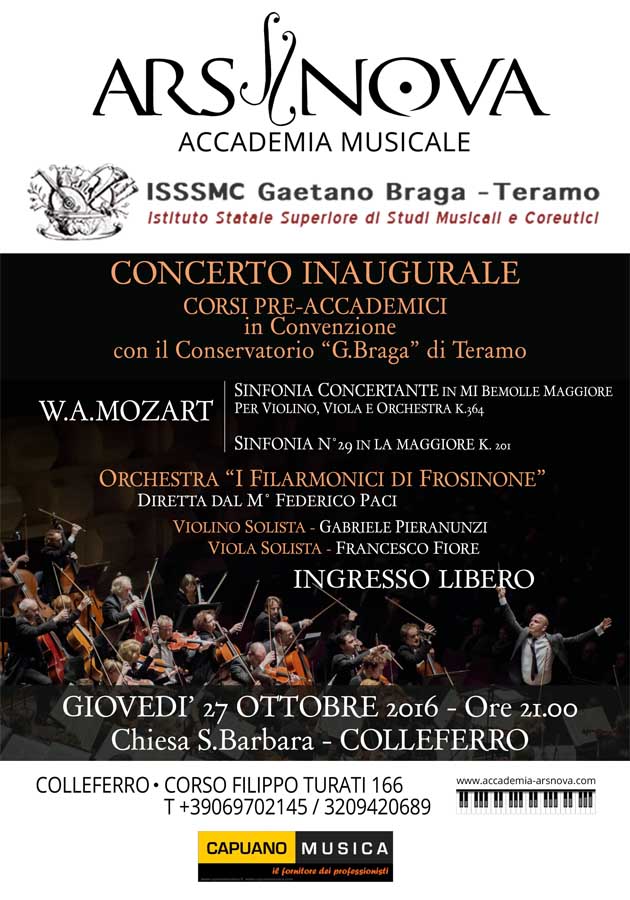 Si tratta del Concerto inaugurale dell’Anno Accademico dell’Ars Nova (•>), l’Accademia musicale che, in convenzione con il Conservatorio “G. Braga” di Teramo, ha istituito i Corsi pre-accademici di Musica Classica e Jazz.