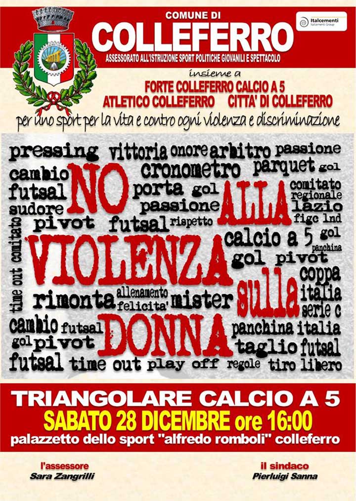 COLLEFERRO – Sabato 28 Dicembre alle ore 16 al Palazzetto dello Sport “Alfredo Romboli” di Colleferro, si svolgerà un triangolare di calcio a 5 “per uno sport per la vita e contro ogni violenza e discriminazione”.