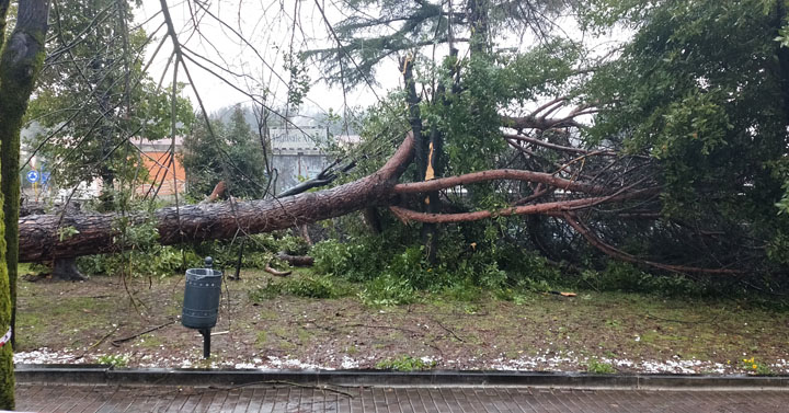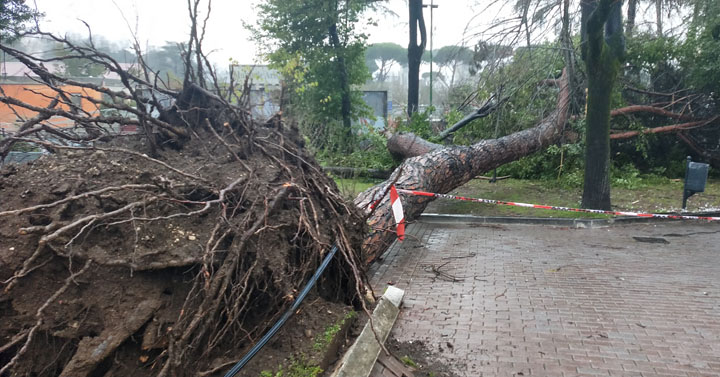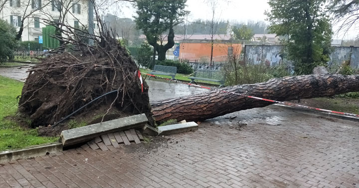 Il grosso fusto dell’albero, spinto dal vento che ne aveva fortemente sollecitato la chioma, si è inclinato al punto da sradicarsi dall’aiuola sollevando anche parte dell’adiacente pavimentazione.
