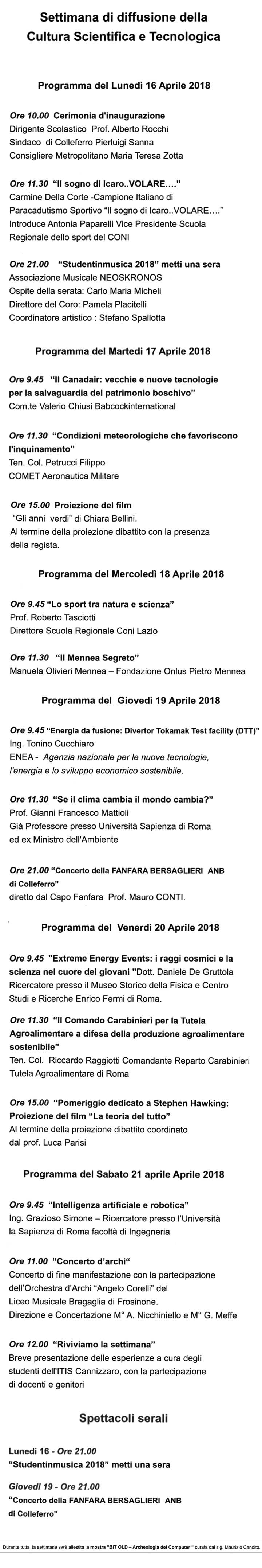 Come – sempre con maggior successo – ormai da tre anni, presso l’Aula Magna dell’istituto di Via Consolare Latina da Lunedì 16 a Sabato 21 Aprile si susseguiranno una serie di conferenze a carattere scientifico, e non solo, tenute da docenti universitari e/o da esperti nelle varie tematiche, provenienti dal mondo produttivo, dell’industria e dello sport unite ad alcuni spettacoli serali di tipo musicale.