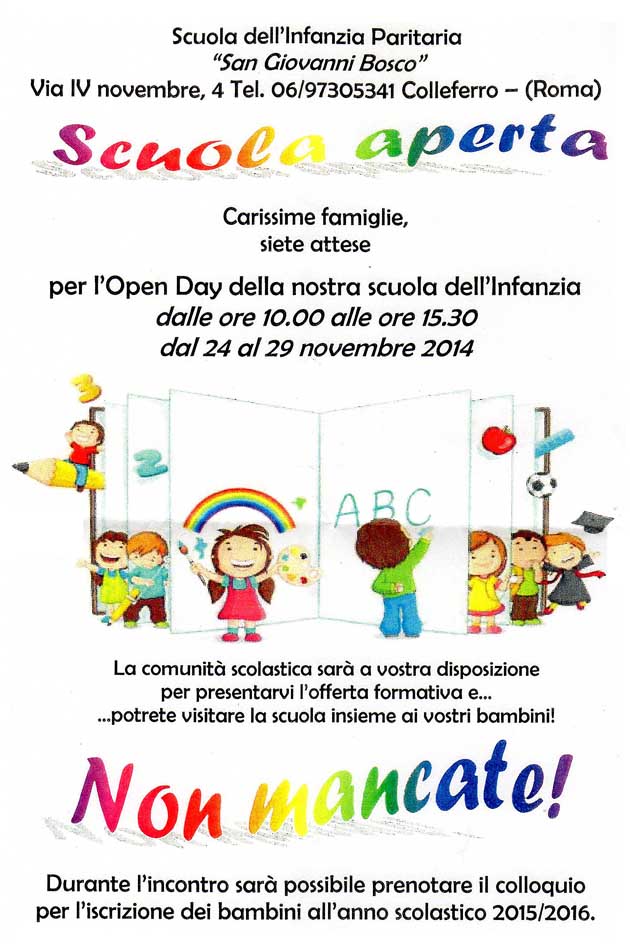 COLLEFERRO (RM) – La Scuola dell’Infanzia Paritaria “San Giovanni Bosco” ha organizzato un interessante “Scuola Aperta” dedicato alle famiglie da Lunedì 24 a Sabato 29 Novembre.
