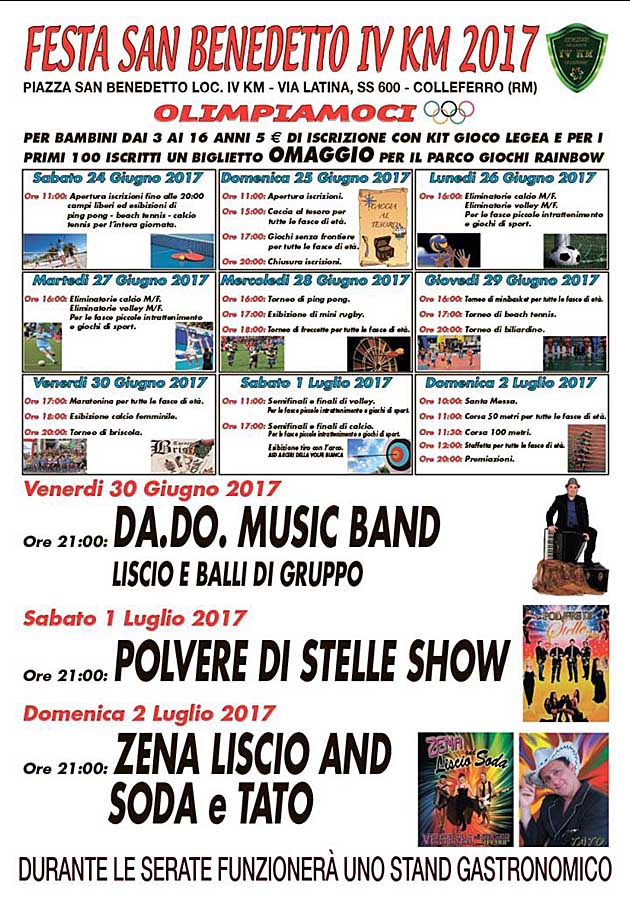 COLLEFERRO IV Km (RM) – Anche quest’anno, come da ormai tradizione, nella zona IV km di Colleferro, torna la Festa di San Benedetto, edizione 2017, organizzata dall’omonimo Comitato locale con il Patrocinio del Comune e la sponsorizzazione della Banca di Credito Cooperativo di Roma.