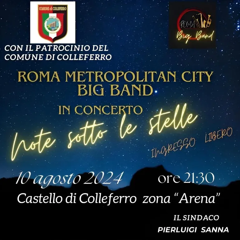 Presso la splendida cornice del Castello di Colleferro (zona “Arena”), si terrà il concerto “Note sotto le stelle” della Roma Metropolitan Big City Band, che eseguirà i più grandi successi della storia della musica, dallo swing al funky, dai ritmi latino-americani alla disco.