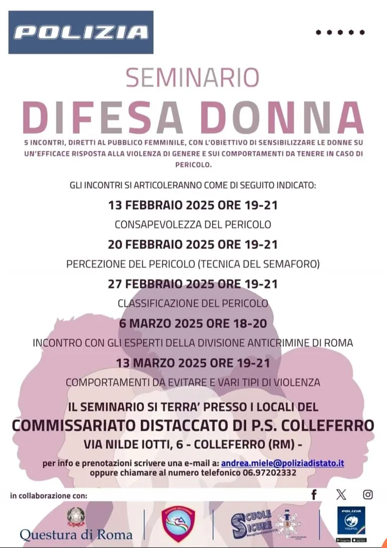 Tutti gli incontri del seminario si terranno presso il Commissariato di Colleferro in Via Nilde Iotti 6: per chi volesse prenotarsi e fosse interessato o avesse semplicemente bisogno di informazioni il contatto e-mail è andrea.miele@poliziadistato.it oppure il numero telefonico 06.97202332