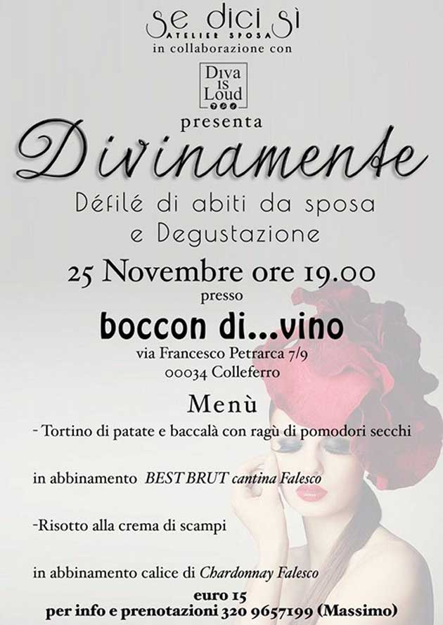 COLLEFERRO (RM) – Se Dici Sì, in collaborazione con Diva is Loud Hair Style (Via Casilina, 38 Colleferro), presenta una piccolo assaggio del suo campionario di abiti da sposa, in un défilé presso l’accogliente e intimo locale “Boccon di… vino” a Colleferro in via Petrarca il 25 Novembre alle ore 19.