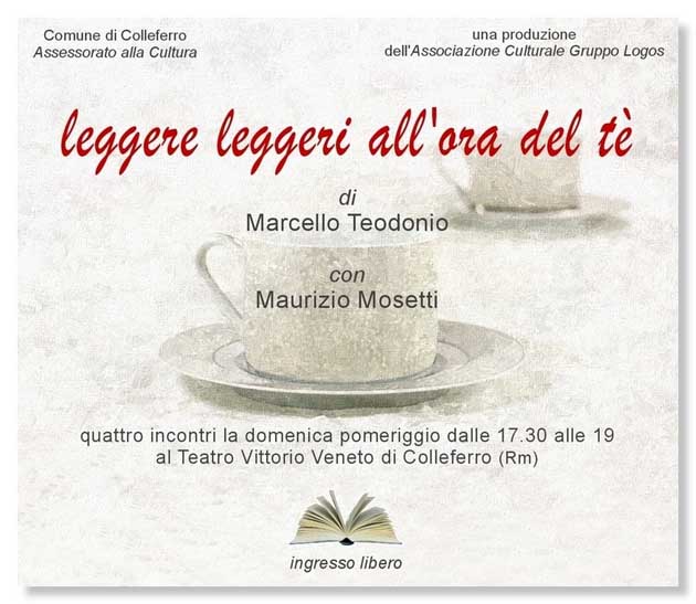 L’iniziativa, promossa dal Comune, a cura dell’Associazione Culturale Gruppo Logos, si tiene presso il teatro “Vittorio Veneto” e rientra nella produzione di Marcello Teodonio intitolata “Leggere leggeri all’ora del té”, che comprende quattro appuntamenti.