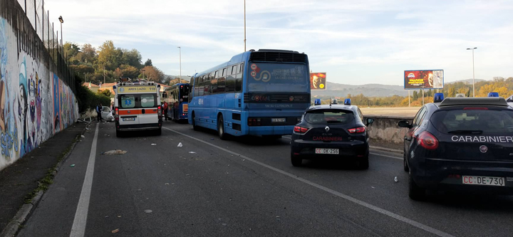 Colleferro. Drammatico incidente in Via degli Esplosivi. Fiat Seicento frontale contro bus Cotral. Gravissima la donna alla guida. Elitrasportato anche il bimbo di 6 anni