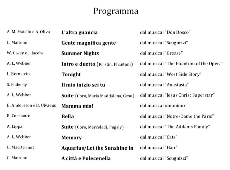 Tanti i talenti che si sono esibiti sul palco emozionando il numeroso pubblico presente con brani cult della storia del musical fino all’esplosione finale di energia nell’ultimo brano che ha coinvolto nel canto tutti i presenti.