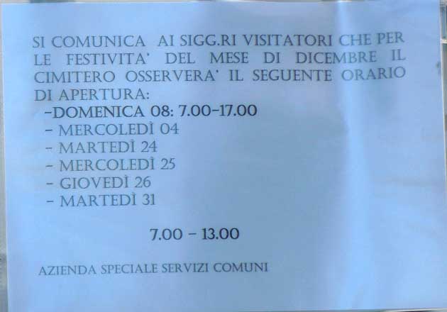 In particolare, l’azienda che è incaricata della custodia del cimitero ha deciso che nei giorni 4, 24, 25, 26 e 31 di questo mese l’orario di apertura è ridotto: dalle 7 alle 13, invece che dalle 7 alle 17. Sullo stesso cartello viene evidenziato che il giorno della Festa dell’Immacolata (domani), l’orario non cambierà, e cioè sarà dalle ore 7 alle 17… Tale evidenza sembra quasi voler “sottolineare” l’eccezionalità dell’evento…
