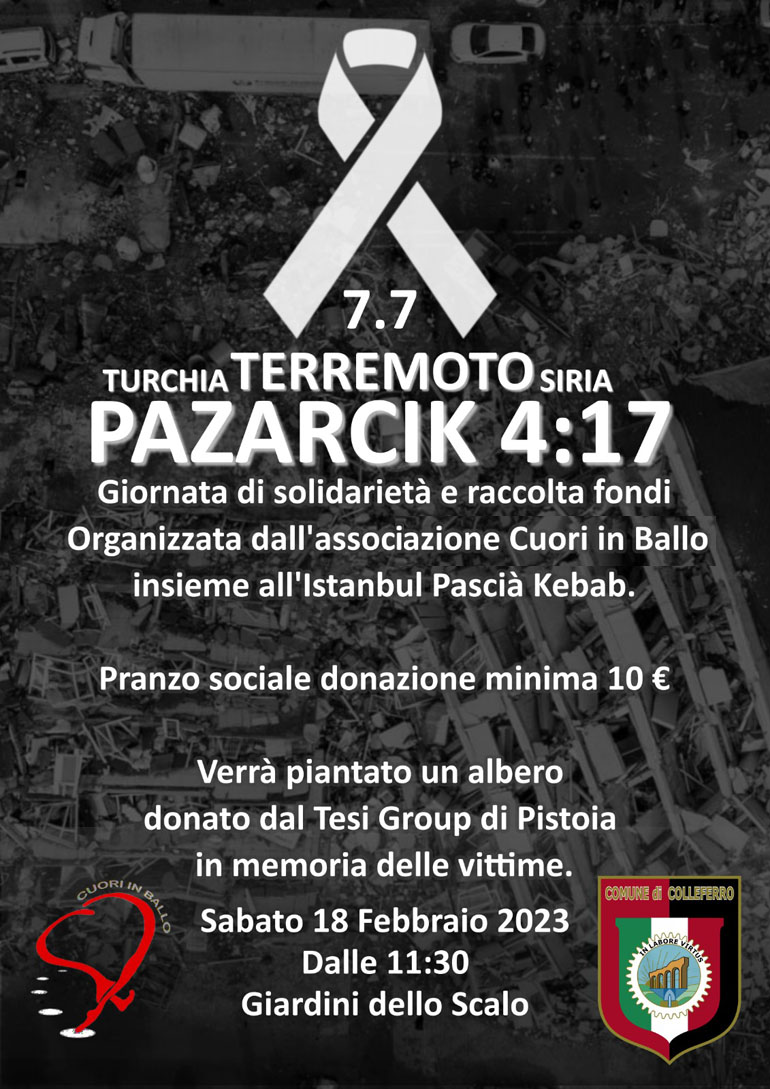 COLLEFERRO SCALO – Per Sabato 18 Febbraio 2023, a partire dalle ore 11,30, presso i giardini di Colleferro Scalo, l’Associazione Cuori in Ballo, in collaborazione con l’Istanbul Pascià Kebab, ha organizzato una giornata di solidarietà con raccolta fondi in favore delle vittime del terribile terremoto che ha colpito la Turchia e la Siria.