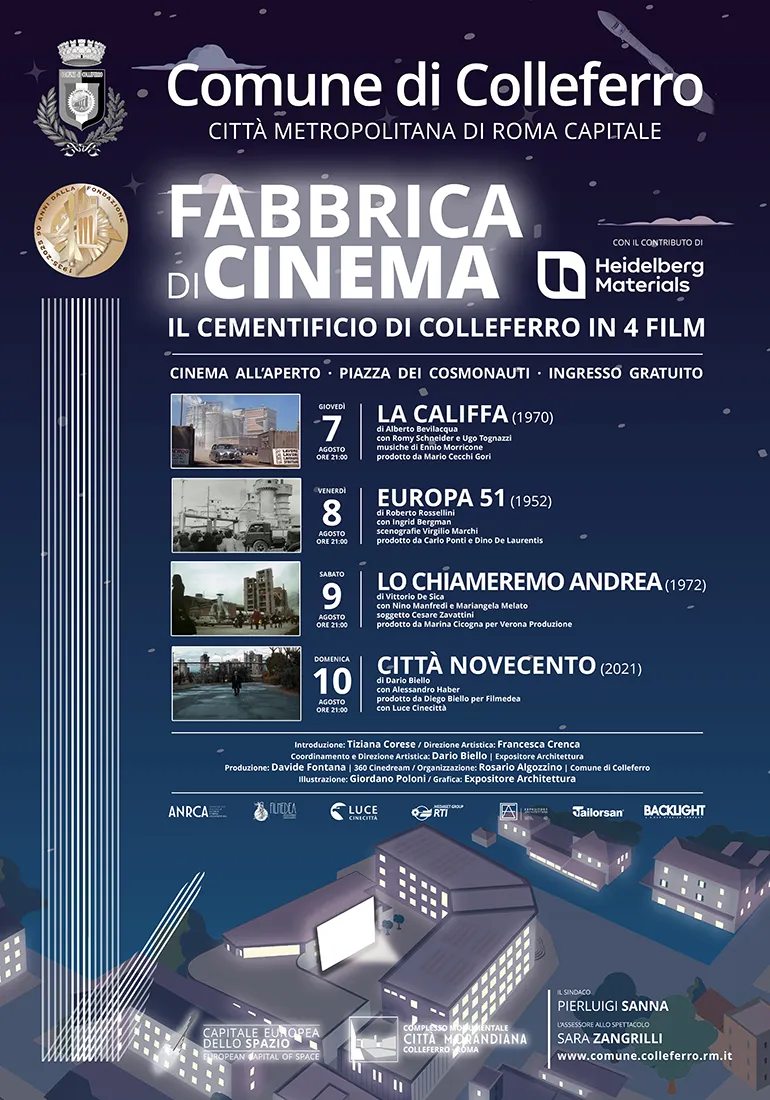 L’iniziativa ha il supporto di Heidelberg Materials, il nuovo brand che ha raccolto l’eredità del marchio Italcementi, società che a sua volta aveva acquisito l’impianto dalla Società Italiana per la produzione di calce e cementi Segni nel 1972. Lo storico impianto ha festeggiato i 100 anni nel 2019 e si può dire che abbia accompagnato tutta la storia della città di Colleferro divenendone un’icona non solo per la comunità, ma anche per il cinema italiano.