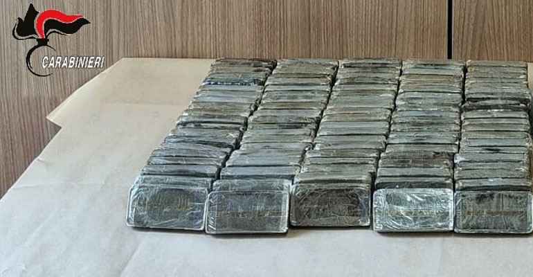 Nel corso del controllo notando la sua eccessiva agitazione, i militari insospettiti eseguivano più accurate verifiche sul suo conto e durante la perquisizione veicolare, occultato nel cofano posteriore dell’autovettura, rinvenivano 60 panetti di “hashish” per un peso complessivo di 6 kg, motivo per cui il giovane è stato arrestato e la droga sequestrata.