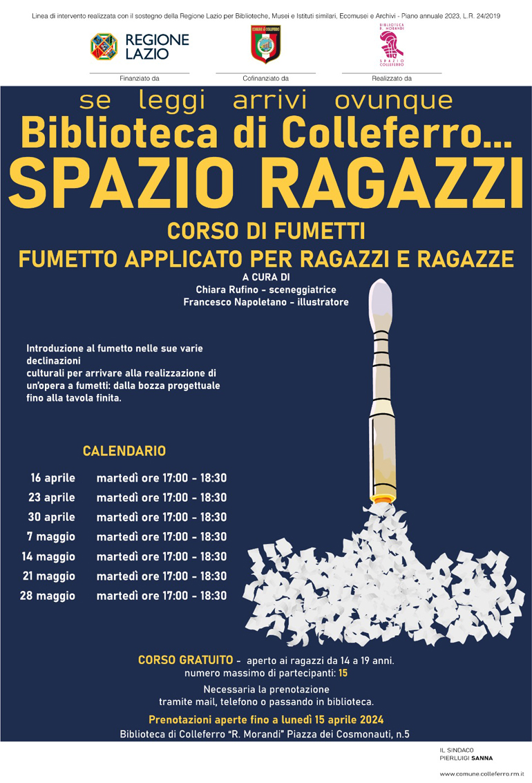 Gli incontri laboratoriali, rivolti ai ragazzi ed alle ragazze dai 14 ai 19 anni di età, che si terranno nell’Aula di Alta Formazione della nostra biblioteca a partire dal 16 aprile 2024 per un totale di sette appuntamenti settimanali, saranno un’importante occasione per approfondire il fumetto nelle sue varie declinazioni culturali e per arrivare alla realizzazione di un’opera a fumetti originale.