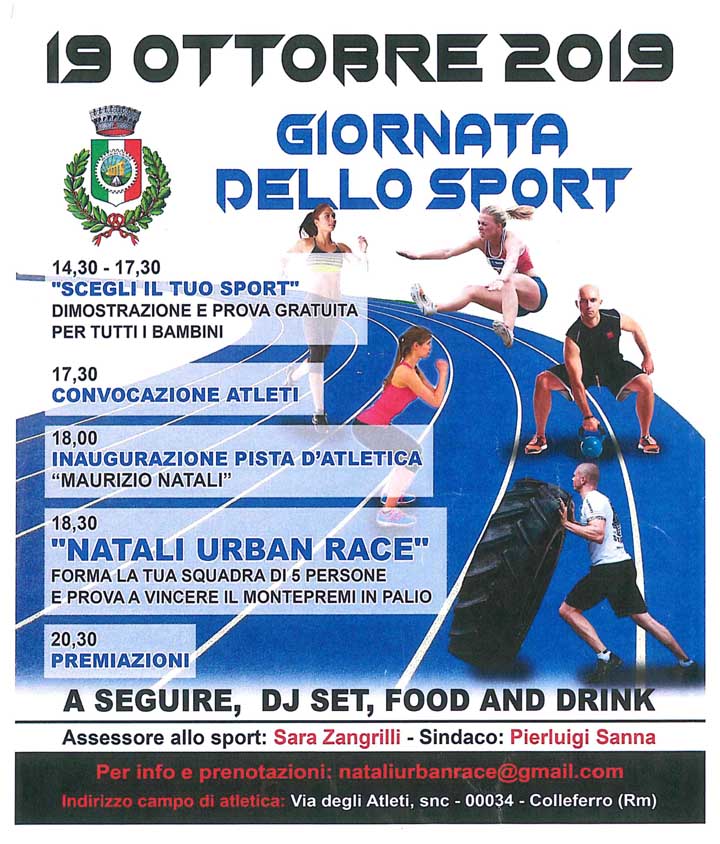 COLLEFERRO – Sabato prossimo 19 Ottobre presso il Campo sportivo “Maurizio Natali” di Via degli Atleti a Colleferro si terrà la Giornata dello sport.