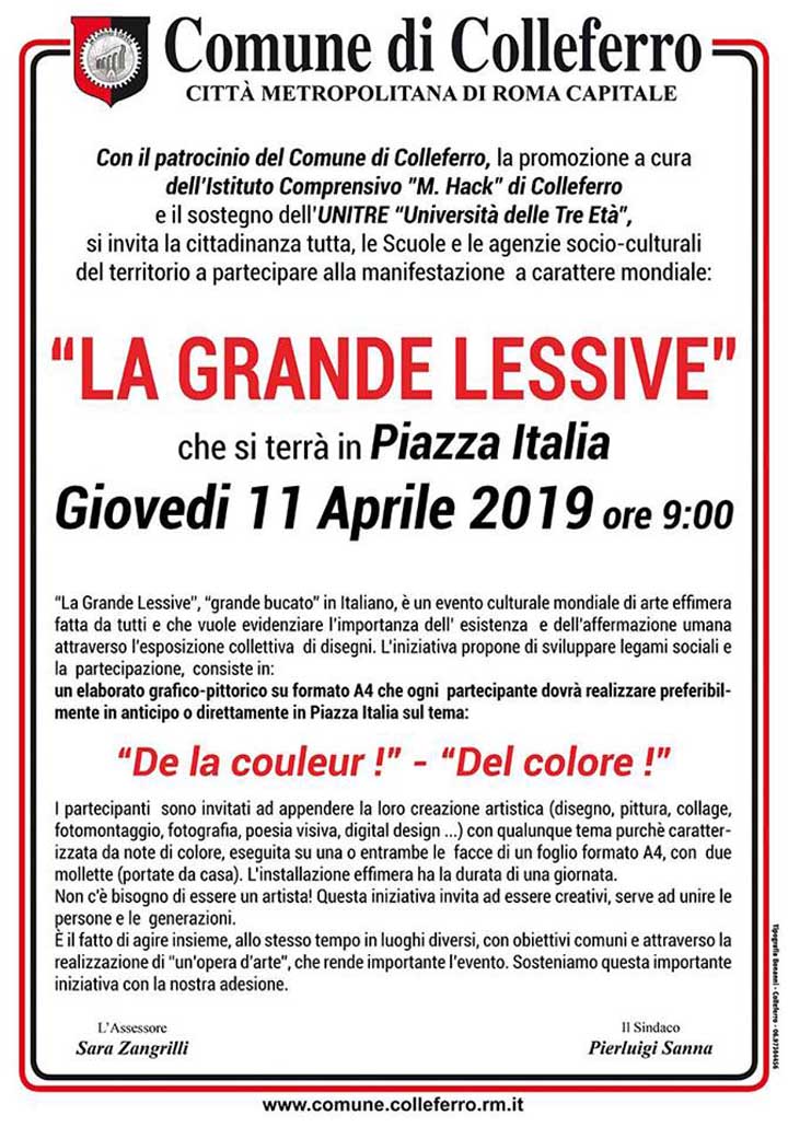 COLLEFERRO (Eledina Lorenzon) – La Grande Lessive, in italiano “grande bucato”, torna per il terzo anno ad animare Piazza Italia nella giornata di Giovedi 11 Aprile con inizio alle ore 9, anche se, come lo scorso anno [qui l’articolo •>], non si annunciano i favori del meteo (in alto un’immagine della manifestazione dello scorso anno)…