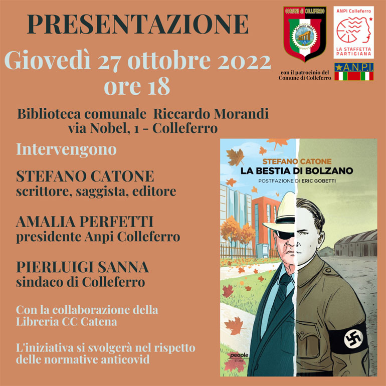 La presentazione è organizzata da Anpi Colleferro “La Staffetta Partigiana” con il Patrocinio del Comune di Colleferro e con la collaborazione della Libreria CC Catena.