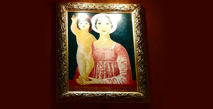 L’artista nell’opera – che già da diversi anni è posizionata nella parete a destra dell’altare – si è ispirato palesemente alle Madonne col Bambino quattrocentesche, reintrerpretando il soggetto che fa suo con una sensibilità contemporanea, rendendo “le figure più iconiche, assottigliandone i volumi e semplificando le fisionomie. Inoltre introduce un pittoricismo movimentato, ma morbido, in cui si plasmano dolcemente le figure” .