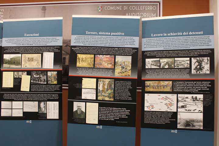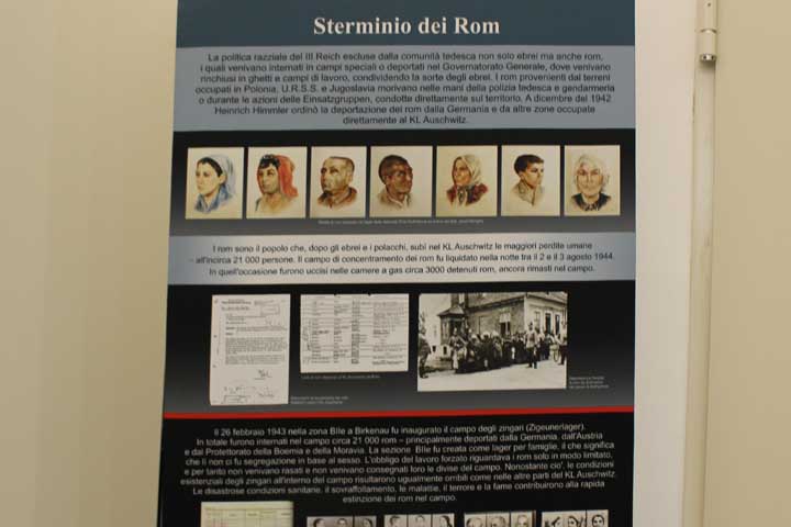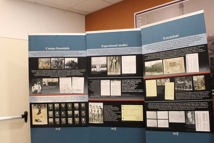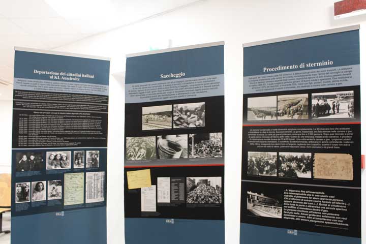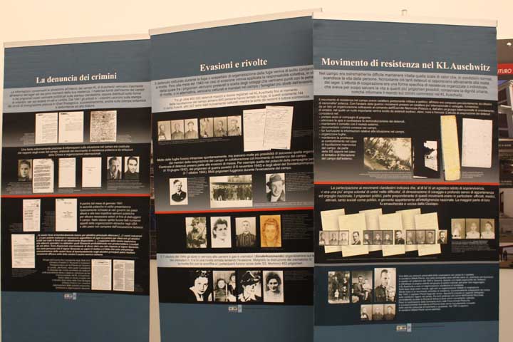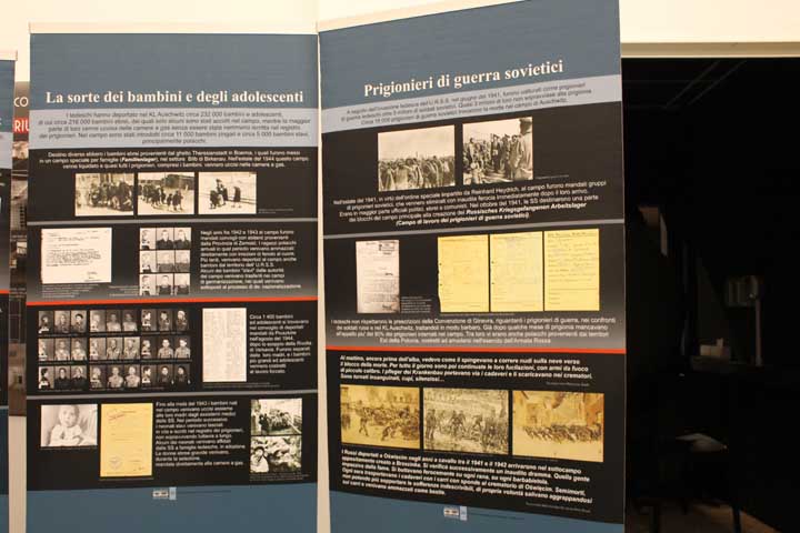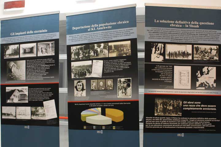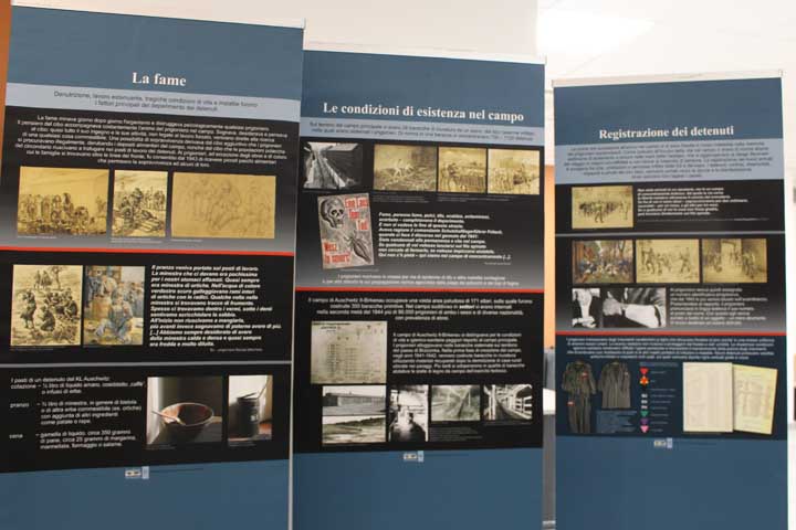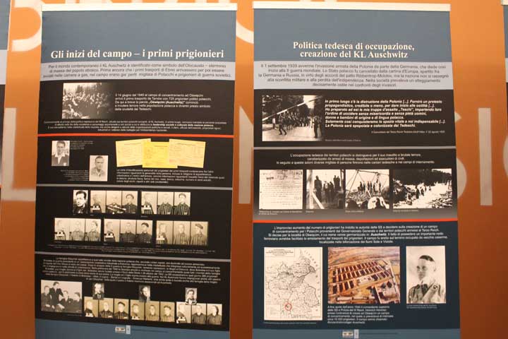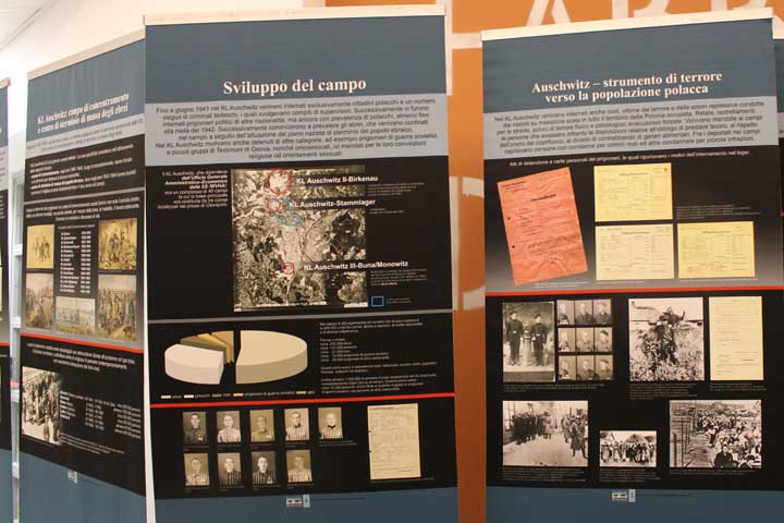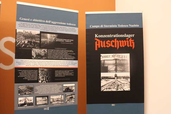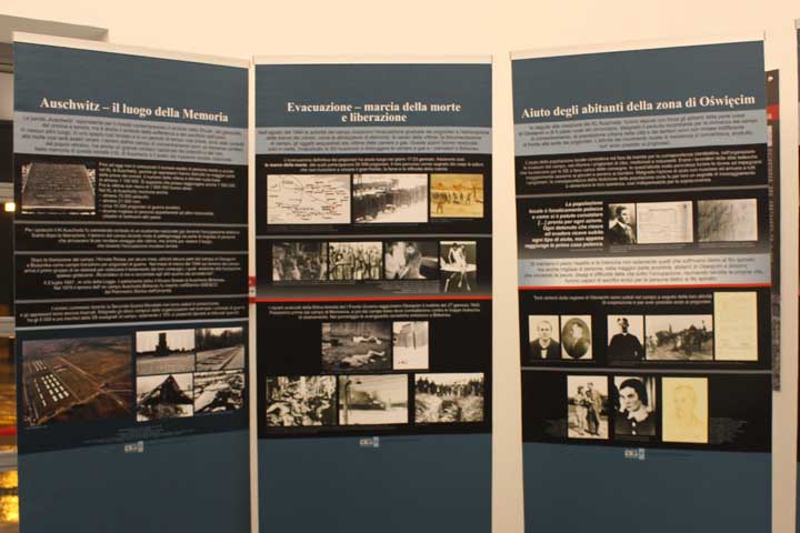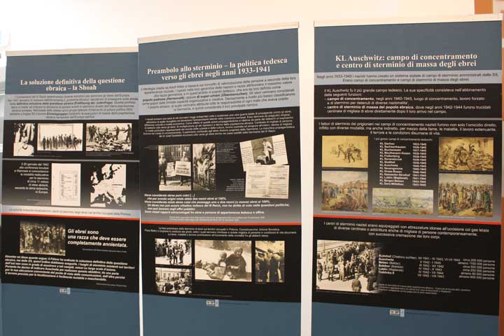 Nel “foyer” è stata allestita l’interessante mostra documentaria “Konzentrationslager Auschwitz”, realizzata dal Museo di Auschwitz-Birkenau, suddivisa in sezioni tematiche cronologiche, dove si ripercorre la storia e l’evoluzione del sistema della vita e dell’organizzazione dei campi di concentramento e della persecuzione degli ebrei dal 1933, focalizzando l’attenzione sull’evoluzione di Auschwitz che, istituito su ordine di Himmler il 27 Aprile 1940 come campo di concentramento per oppositori politici polacchi, divenne successivamente campo di sterminio fino al giorno dell’abbattimento dei cancelli, avvenuto il 27 Gennaio 1945.