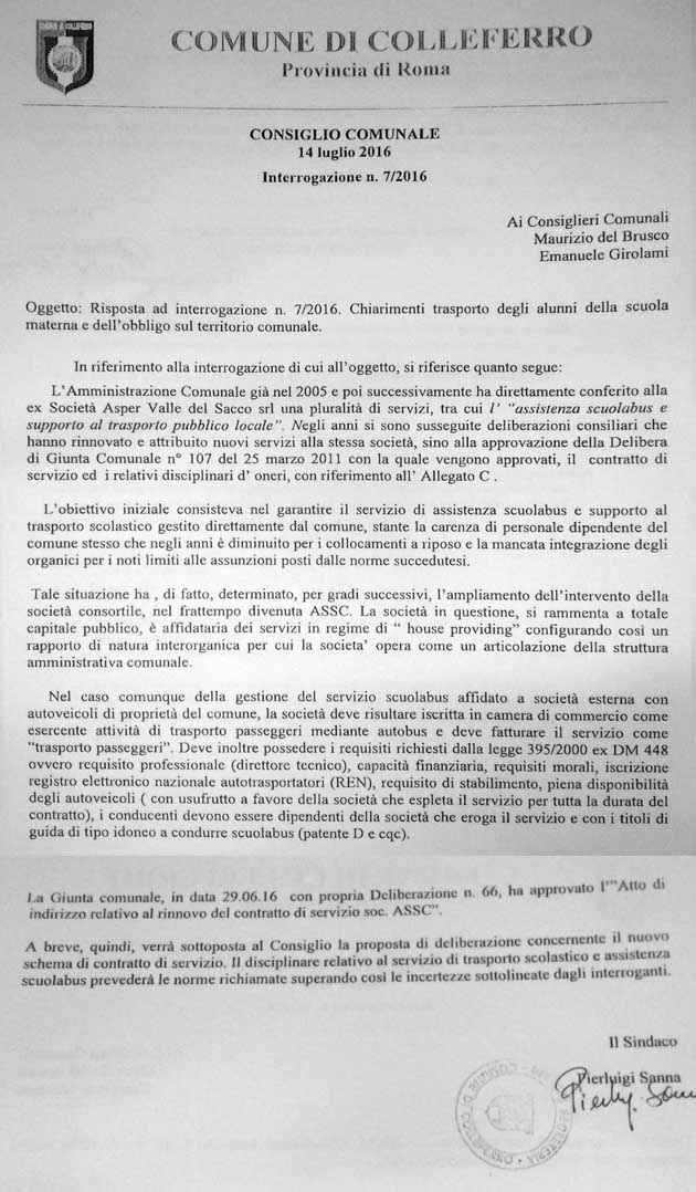 La risposta, com’era prevedibile non veniva considerata soddisfacente dal Consigliere comunale Maurizio Del Brusco, il quale evidenziava che le irregolarità sull’affidamento del servizio di scuolabus avrebbero potuto avere anche conseguenze penali per i proprietari dei mezzi, nel caso specifico il Comune di Colleferro e quindi lo stesso Sindaco Pierluigi Sanna.