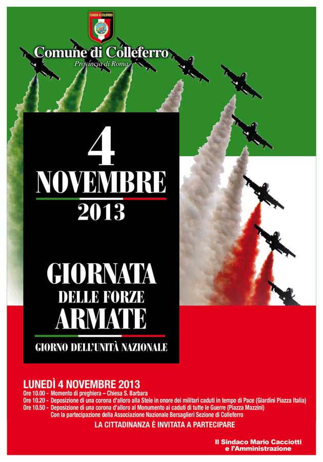 COLLEFERRO (RM) – Lunedì prossimo 4 Novembre, nella giornata nazionale delle Forze Armate e dell’Unità d’Italia, il Comune effettuerà una solenne celebrazione alla quale è invitata a partecipare tutta la popolazione.