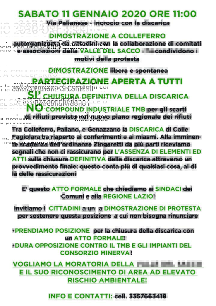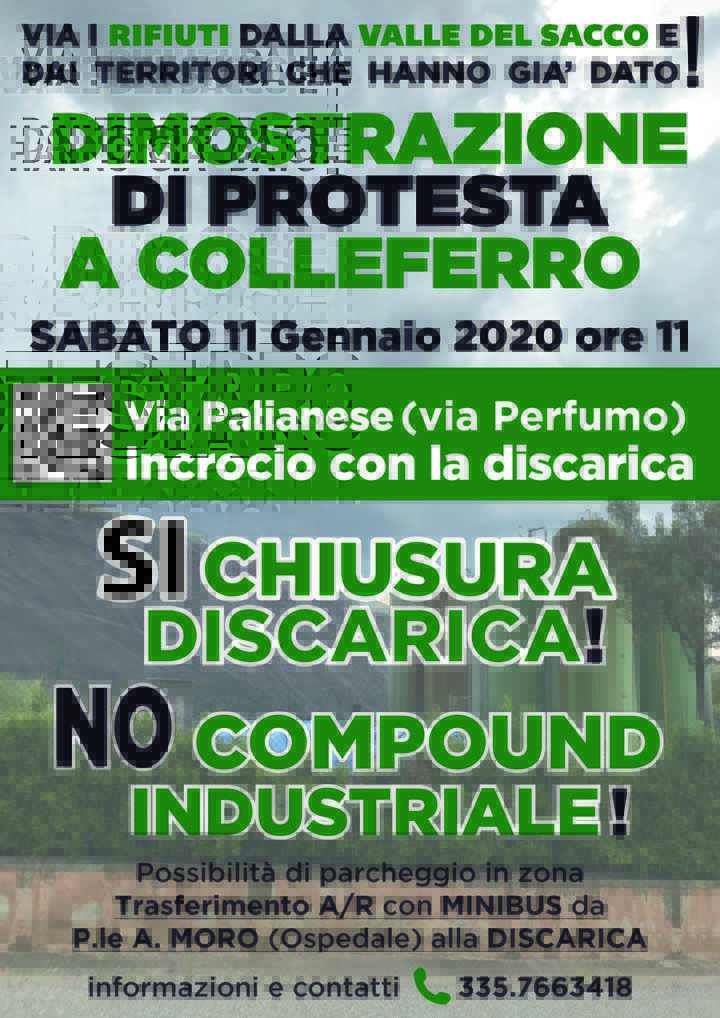 «A Colleferro la prima protesta del 2020, Sabato 11 gennaio, ore 11, in via Palianese, all’incrocio della discarica di colle Fagiolara. Un mini BUS è a disposizione per il trasferimento A/R, in partenza alle ore 10.45 da p.le A. Moro (davanti l’ospedale).
