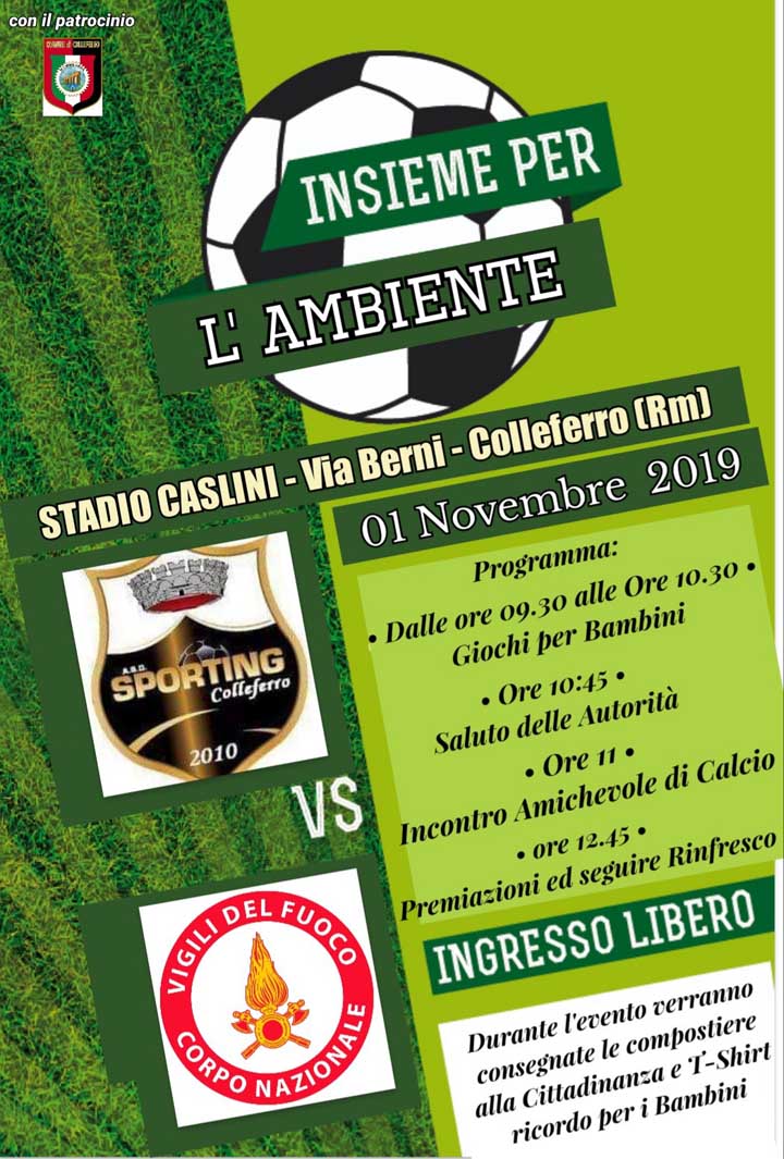 «Questo Venerdì 1 Novembre, allo Stadio Caslini di Via Berni a Colleferro, la società calcistica dello Sporting Colleferro, militante nel campionato di III Categoria – Girone C, con il patrocinio del Comune di Colleferro, dà appuntamento a tutta la cittadinanza per la I Edizione di “Insieme per l’ambiente”.