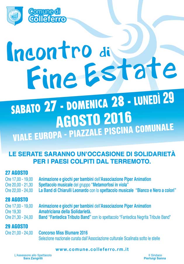 COLLEFERRO (RM) – «L’incontro di fine Estate è una maratona di solidarietà. La raccolta fondi: un aiuto concreto per la ricostruzione delle città di Amatrice, Accumoli e Pescara del Tronto» così il Sindaco Pierluigi Sanna in apertura della tre giorni dell’Incontro di Fine Estate in programma oggi, Sabato 27, a Lunedì, 29 Agosto il Largo Unitalsi (piazzale della piscina comunale).