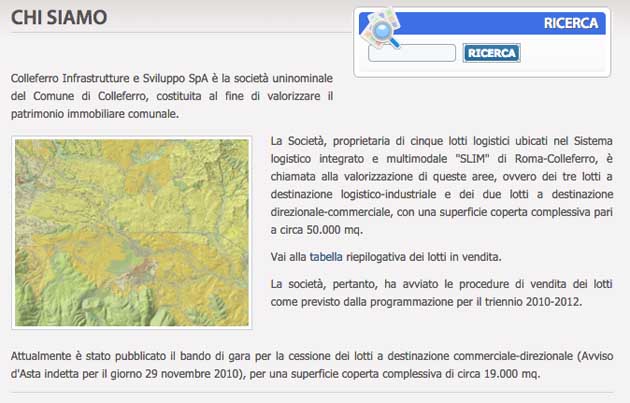 Sullo stesso sito, nella homepage, si legge: «La Società, proprietaria di cinque lotti logistici ubicati nel Sistema logistico integrato e multimodale “Slim” di Roma-Colleferro, è chiamata alla valorizzazione di queste aree…».