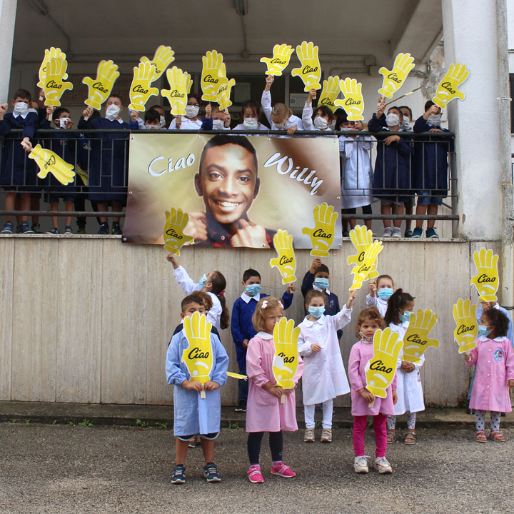 Tutti i bambini hanno poi alzato al cielo tante manine di cartone giallo con la scritta “Ciao” e ci auguriamo che l’esempio di altruismo di Willy li aiuterà a comprendere come solidarietà, accoglienza verso gli altri ed integrazione, possono davvero migliorare il mondo, eliminando ogni forma di violenza.