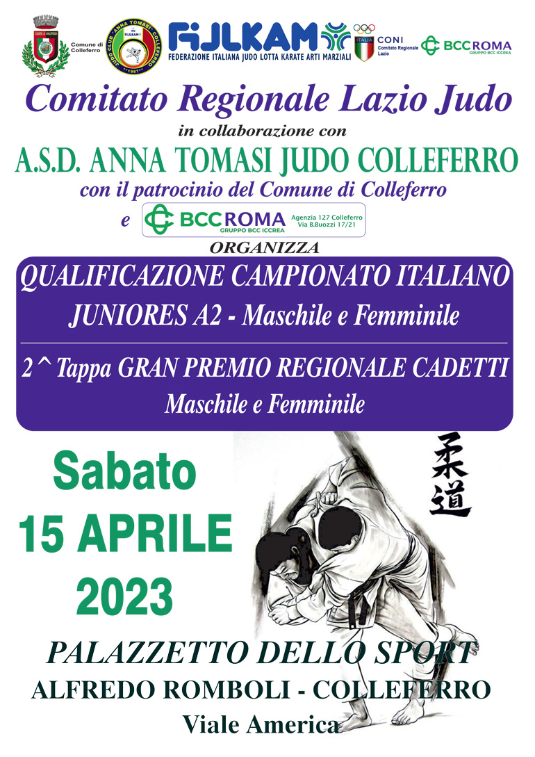 COLLEFERRO – Domani, Sabato 15 Aprile, dalle ore 9,30, nel PalaRomboli di Colleferro si svolgeranno la Qualificazione al Campionato Italiano di Judo (cat. Juniores A2 – maschile e femminile) e la 2^ Tappa del Gran Premio Regionale cadetti – maschile e femminile – della medesima disciplina.