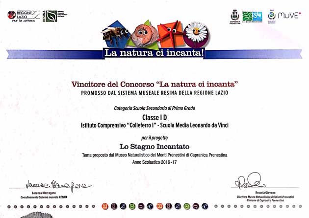 Le classi delle scuole di tutto il Lazio che hanno partecipato al Concorso sono state 97 (scuola materna, primaria e secondaria di primo grado) e la classe I D della Scuola Media “Leonardo da Vinci” dell’Istituto Comprensivo Colleferro 1 è risultata vincitrice nella categoria della scuola secondaria con il suo lavoro “Lo stagno incantato”, un gioco da tavolo sullo stagno e il suo ecosistema.