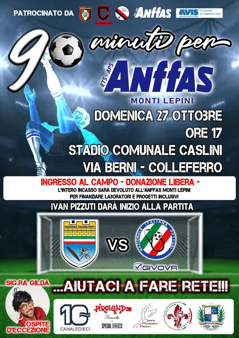 COLLEFERRO – Ancora un bellissimo appuntamento con la solidarietà e lo sport: questa volta l’invito a partecipare numerosi e sostenere “Anffas Monti Lepini” è per il prossimo 27 Ottobre alle ore 17 presso lo stadio Caslini di Via Berni a Colleferro per dare tutti insieme il via alla partita di calcio “90 minuti per Anffas Monti Lepini” organizzata in collaborazione e con il patrocinio del comune di Colleferro, l’Avis di Colleferro, il Colleferro calcio, la ProLoco e l’Anffas Monti Lepini che si occupa come associazione nazionale di tutte quelle famiglie con persone affette da disabilità intellettiva e del neurosviluppo.